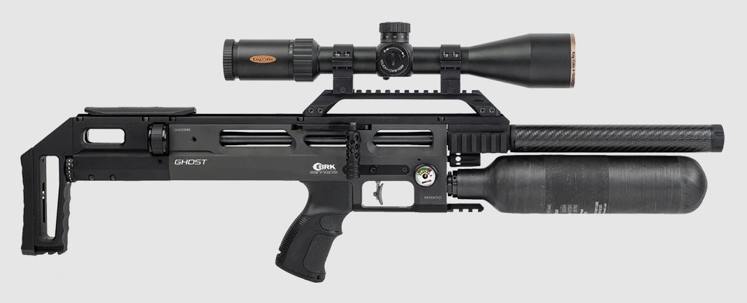 The BRK Ghost incorporates the latest PCP tech and is built around a titanium-coloured chassis to maximise rigidity and accuracy. Three model configurations are available in .177, and .22 calibres, offering power up to 95 ft/lbs – and thanks to a quick and easy interchangeable barrel system, the BRK Ghost’s calibre can be swapped in minutes.